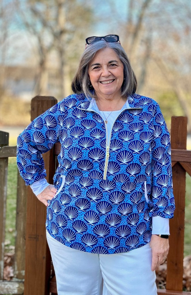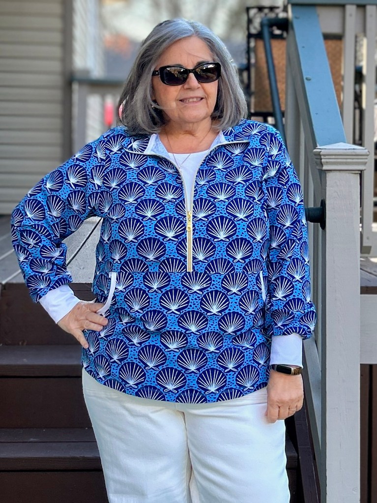 This is the Love Notions Constellation Pullover. The Verona Stretch is available in any of the Swim Collection prints along with several solid colors. (You can also custom print on it!) Next week’s Spring Sale Blog post will include all the modifications made on this pattern~ since the pattern is designed for actual knits as opposed to a stretch woven.