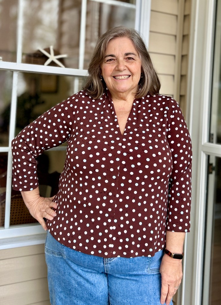I started with the XL with a DD cup size, since my high bust is 39.5″ and my full bust is 44″. (Note the Olympia is designed with 5 different Cup sizes to get the best fit.). I then graded out for my larger waist and hips. Because I have that extra “fluffiness” around my waist (which is always fluctuating day by day), I did remove some of the shaping at the waist. I also did this because I knew I wouldn’t be wearing this top tucked in. If you are built “fluffy” like me I would suggest doing the same when cutting out your fabric. You can always go back and take it in at the waist after trying on your top.