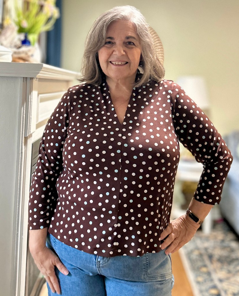 I sewed this Olympia Shirt up in an ITY knit from the NYC garment district. It was pouring outside when I tried to get photos and inside photos are just terrible in my house! I do wish you could see that some of the polka dots are actually light blue! (See photo below)