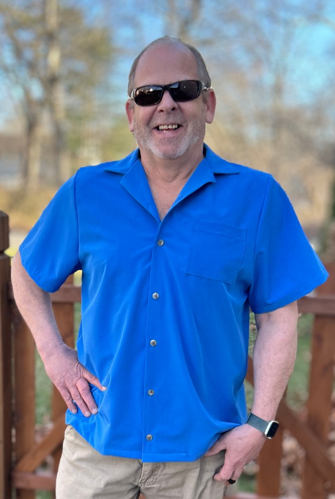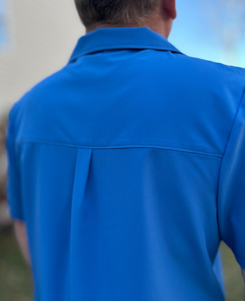 Below is a picture of my husband Love Notions Band Camp shirt in the solid French Blue Verona Stretch. This fabric has such nice drape. This will be perfect to pack for all our summer getaways~ it doesn’t wrinkle!!!!