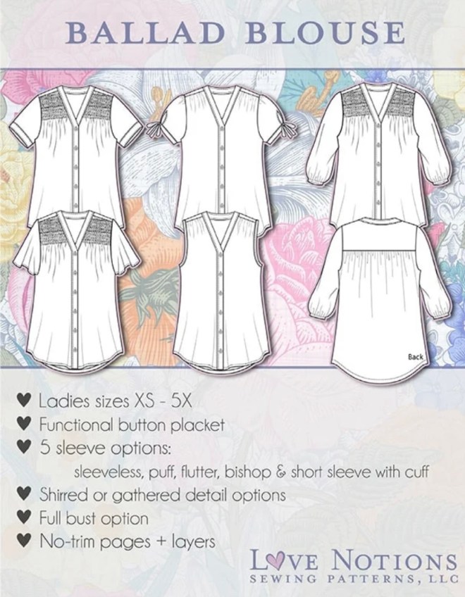 The $6 Feature Friday pattern from Love Notions today, 4/3/26, is the Ballad Blouse. This is such a perfect blouse for spring and summer. Sewn in the right fabric it will keep you looking cool and comfortable right through the summer no matter how hot it gets where you live! Please consider using my affiliate link to purchase your pattern. You can read more about that below in the “Pattern Links” section.