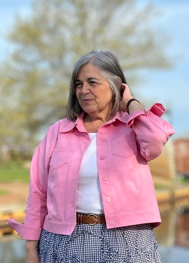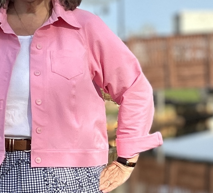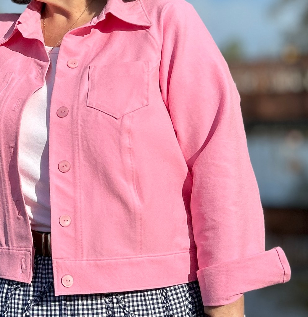 I honestly just really really wanted a pink jacket since I have several denim jackets already. This fabric is also available in several other colors. Here are the details from Kiki Textiles~