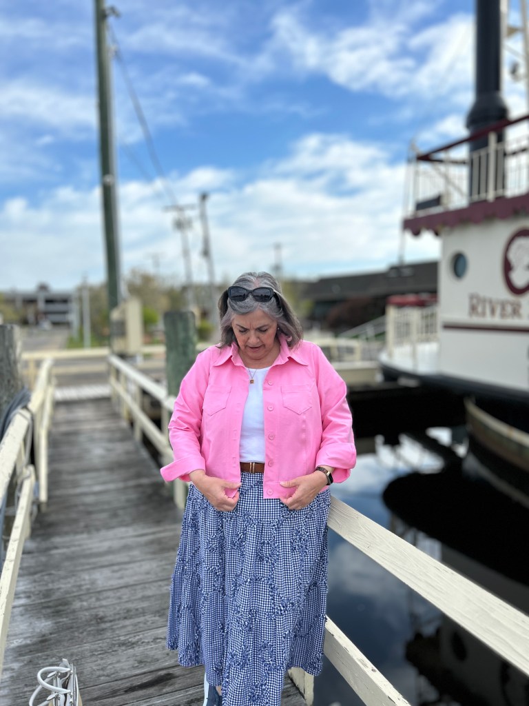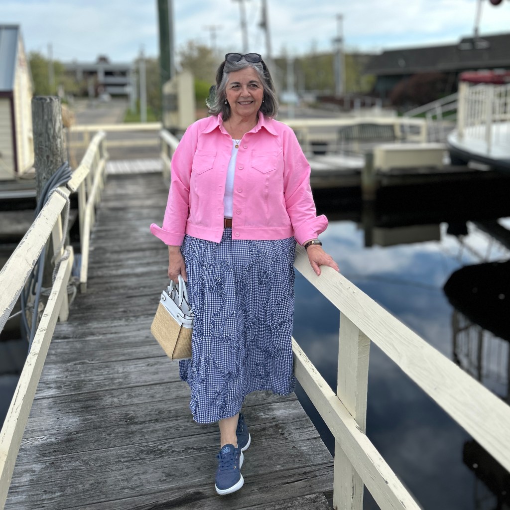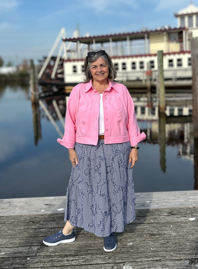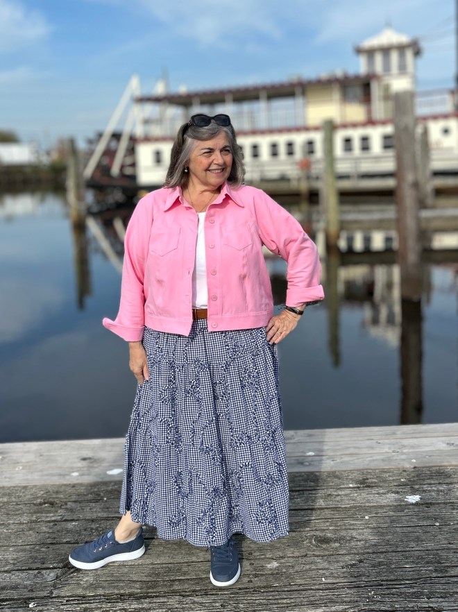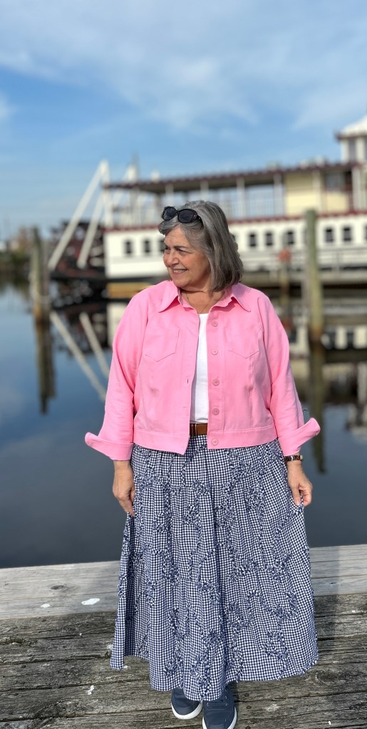 The skirt in all my photos is the three tiered version of the LN Caprice skirt made in a vintage gingham with embellishment . The white top is a La Bella Donna top in cotton modal.