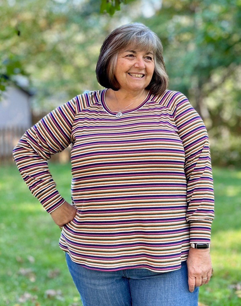 The Lenox Top and Dress pattern is such a versatile pattern. Designed for knit fabrics, it can be casual or dressy depending on your fabric choice. The princess seams make it flattering on all body shapes and sizes. It’s that pattern you didn’t know you needed! It’s a great basic~ that’s not so basic! It includes so many options you can actually mix and match them to create 30 different looks! If you’re a confident beginner, this should be next on your to-sew list! It’s a really quick sew which will make it easy to fill your closet with a few. For my next Lenox I want to find a perfect weight solid white! No boring white tees for me!