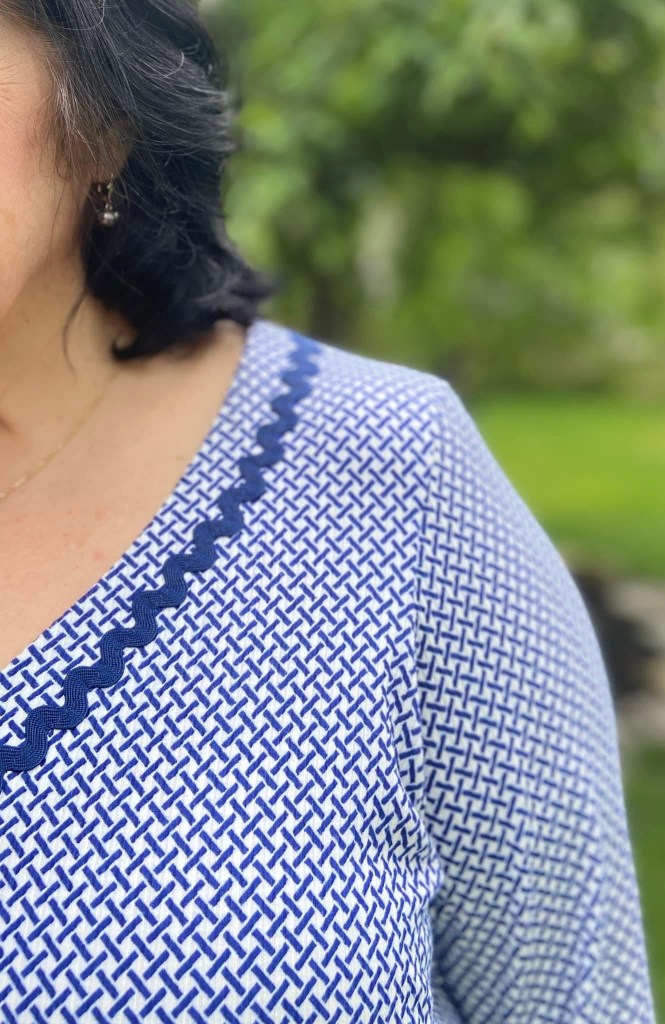 If adjusting for your height(or lack of it like me) remember you must adjust the front, back AND center front pattern pieces. Be sure to use the length/shorten lines indicated on the pattern. Since the Lenox is designed to be closer fitting you want to make sure the waist hits you in the correct spot. You don’t want to just add or delete length at the bottom of the top/dress. See my notes below about the length. I prefer my tops to be just a tad longer, so on my first version I did NOT shorten the top for my lack of height. My later versions did include some additional length.