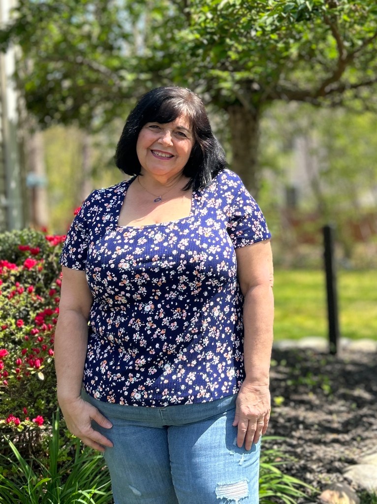 The Navy Floral rib knit was my first version (after my first tester version). I did not make any length adjustments on this version. The length is a bit shorter than my personal preference, but it would probably be fine for most others. This version included the square neckline and the short sleeves. Overall, I was very pleased with the fit (other than the length). I did feel when I leaned forward that the neckline was a tad too low for me while standing up straight it was fine,