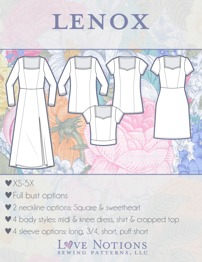 The Lenox is available in sizes XS- 5X. There is a full bust pattern piece included. The Lenox is designed to be fitted with negative ease at the bust, 1″-3″ ease at the waist and 0″-1″ ease at the hips. To get a great fit on the Lenox, be sure to take accurate body measurements and use the body measurement and finishing garment measurement charts to select your size.