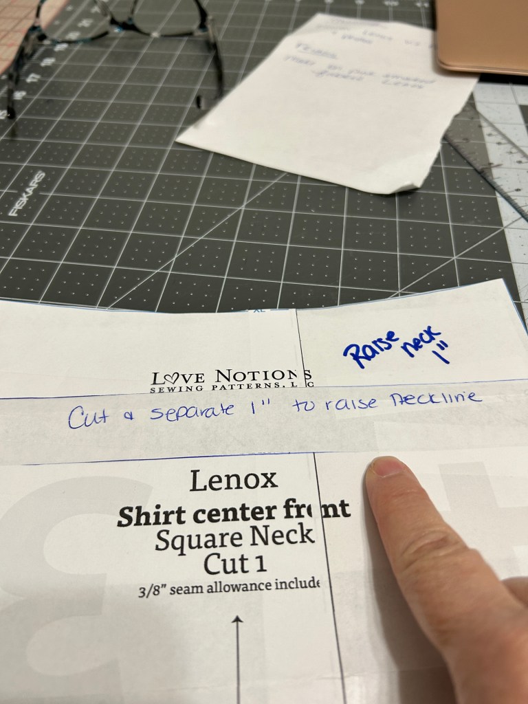 Raising the square neckline of the Lenox was simple to do. Only 2 pattern pieces need to be adjusted, the center front and the side/back neckband.