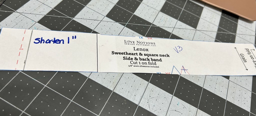 To maintain the curve of the top of the neckline, I cut and spread my center front pattern piece about just a tad over an inch below the top edge. Since I raised the neckline, thus making the neck opening smaller, I needed to shorten my side/back neckband as well. For the neckband, I needed to take off 1″ from the end opposite from the fold marking. If you take it off the folded end, your notches will not match up when trying to attach the side/back neckband to the top.