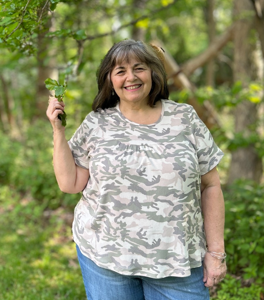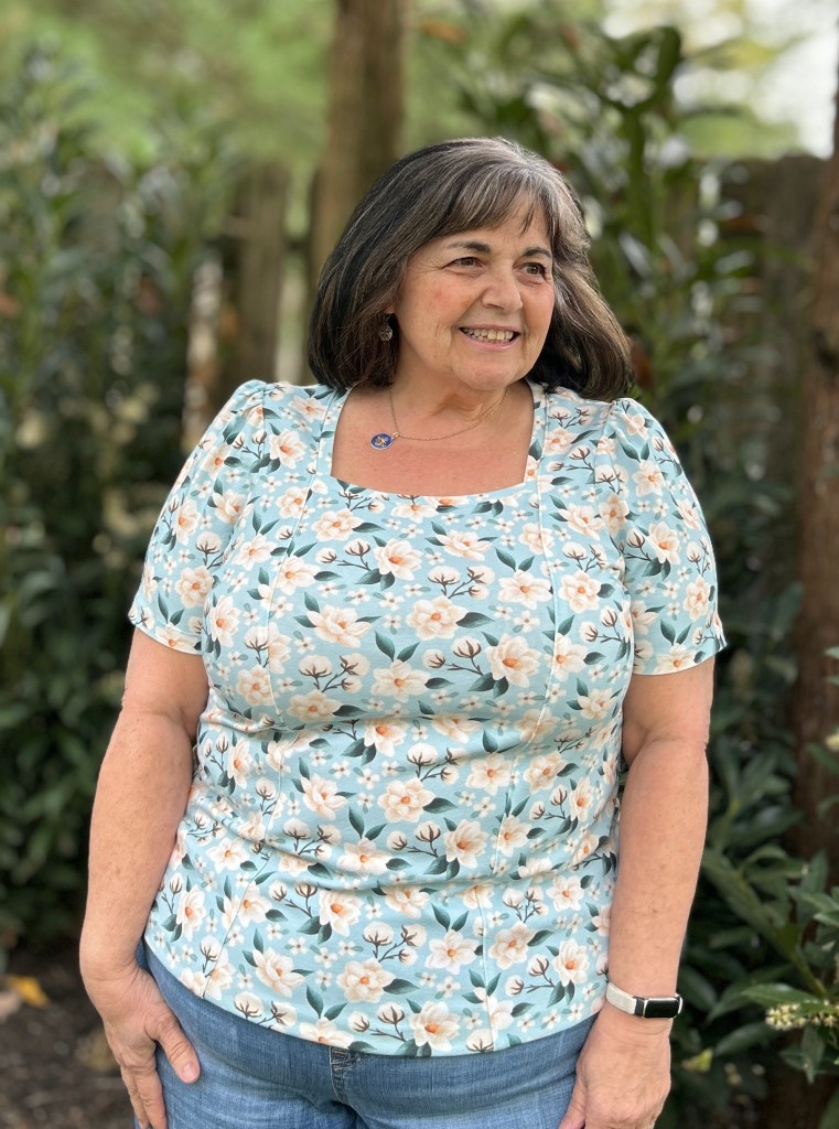 This version is also an XL with the FBA front graded to the 2X hip. For this version, I raised the neckline by 1″ and lengthen the top 2″. I love where this neckline falls on me. I feel it is exactly how the pattern was designed to fit. I am only 5 feet tall, and I know this is why necklines are sometimes too low on me. These are the puff short sleeves. The only thing I didn’t love about this version is the hem(all me)~ stitching a hem on smocked fabric caused some rippling. I’m going to wash it and then try and steam it a bit to see what happens. If that doesn’t work, I think I will shorten it 1″ and re-hem it.