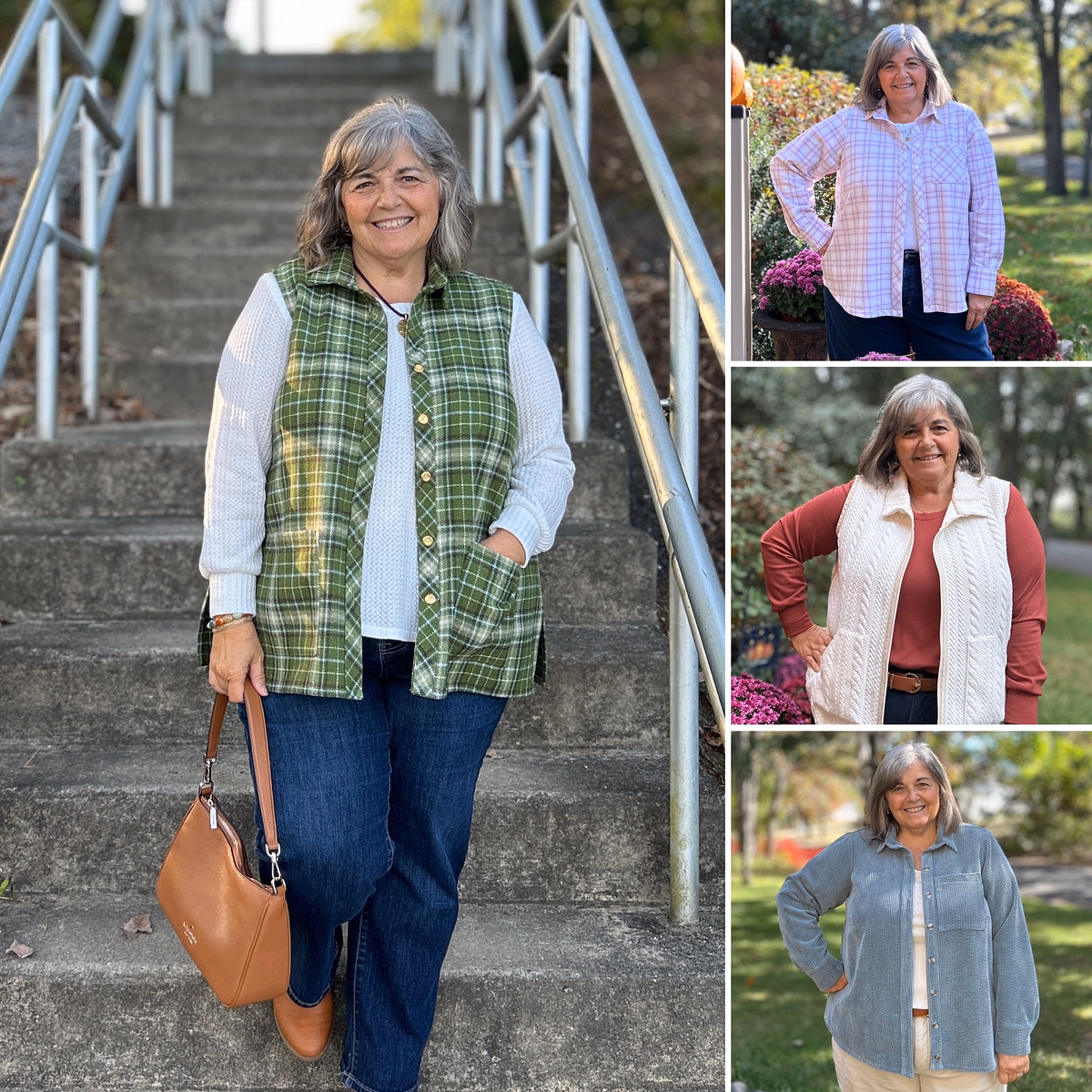 Sometimes we need to pivot. That’s what I’ve decided I needed to do with one of the items on my Fall Plan. I knew I needed/wanted a few new LN Oakley Vests for my Fall and Winter wardrobe. I sewed up the Sage Quilted Knit that I had purchased a few years ago for the Oakley. Although I love the fabric itself, it just doesn’t work as nicely for the Oakley as my other quilted sweater knits did. This particular one has a bit more stretch to it and the recovery was not as good. I know as I wear it, it will become baggier and not be the look I’m going for. So~ I have 2 pieces of quilted sweater knit in my stash~ a gray and a purple~ which I will use instead. I have used this sweater knit in burgundy already for the Oakley and I love it. (See photos below)