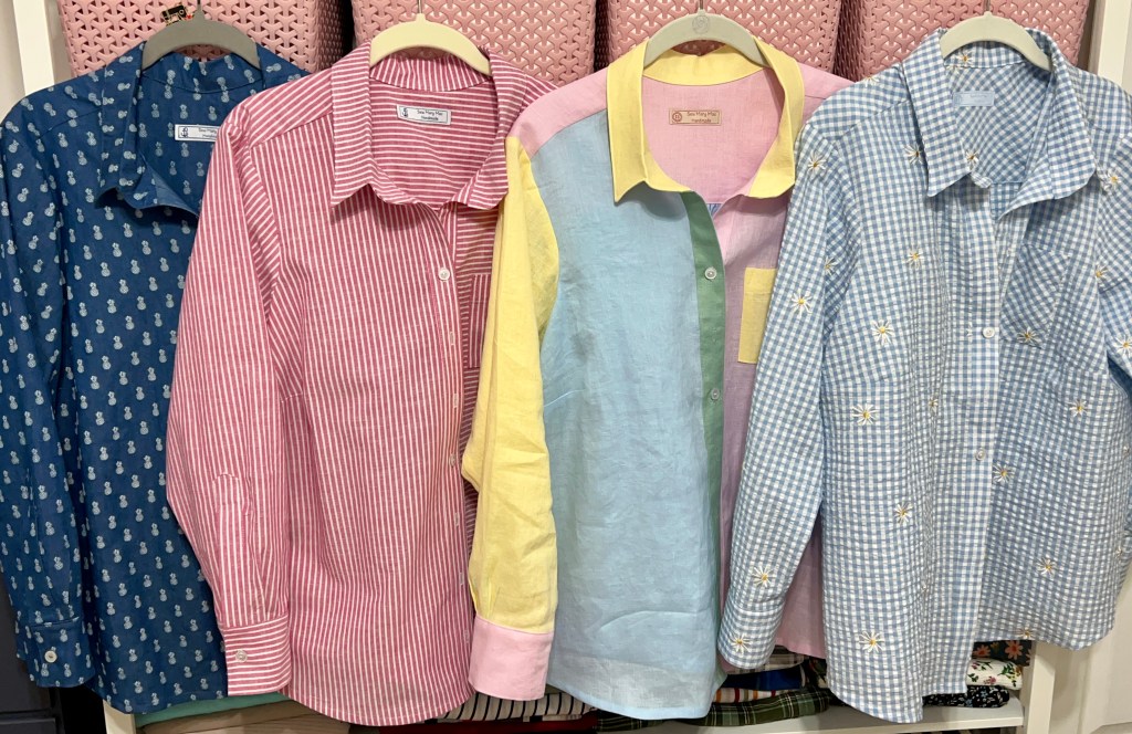 A classic button down is always a staple in any coastal preppy wardrobe. Worn open over a tee is such a classic coastal thing to do! It can also be worn under a cardigan or blazer. In the NorthEast by the coast, our mornings and evenings are often cool. Long sleeve shirts are really worn year round! I wear mine all Spring and Summer! When the weather gets hot I simply roll up my sleevesI My linen and seersucker Arias are some of my most worn! Want to read more about my “Coastal Preppy Wardrobe” and which Love Notions patterns I use to create it? Check out this blog post!